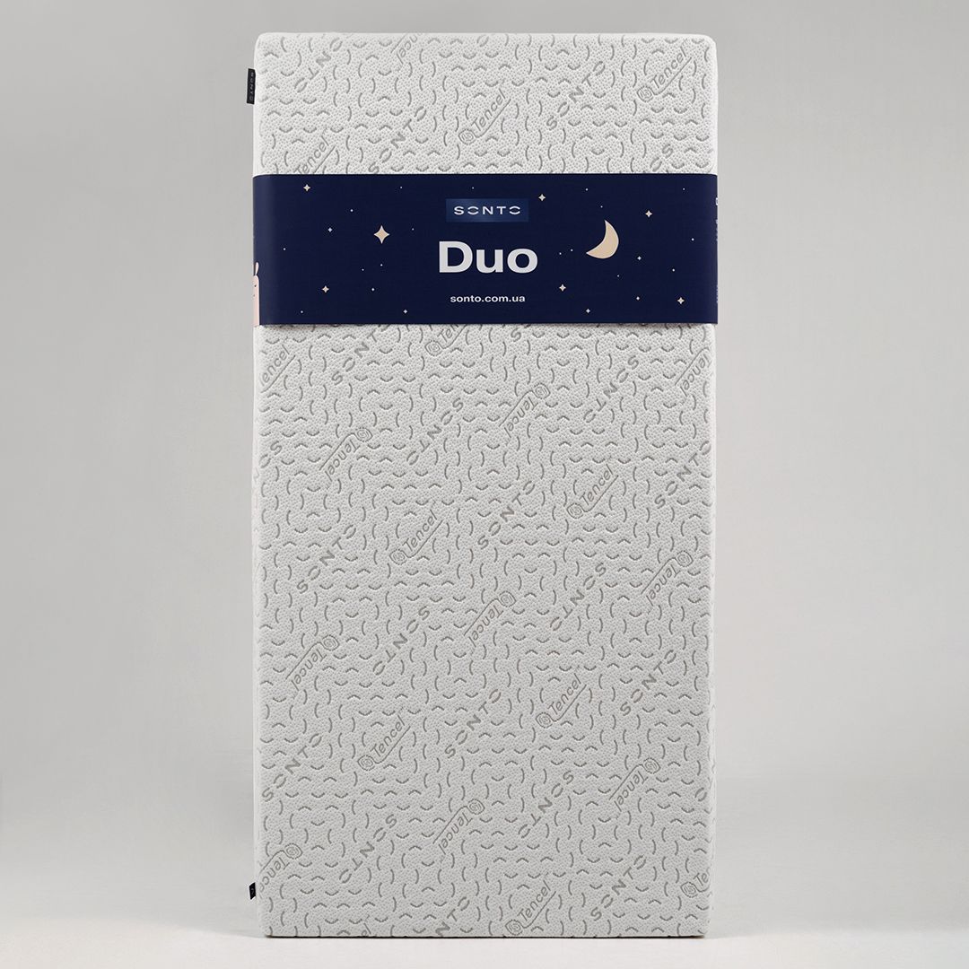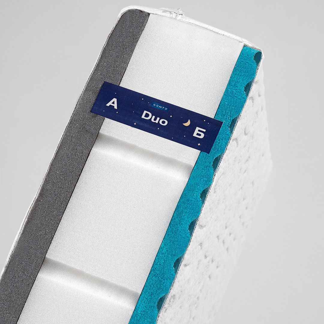 Гипоаллергенный, двусторонний матрас Sonto DUO, сочетающий в себе 2 полноценных матраса: от рождения и до момента, когда ребенок начал ходить (ориентировочно год) и после того, как ребенок начал ходить и учитывает особенности формирования опорно-двигательного аппарата.