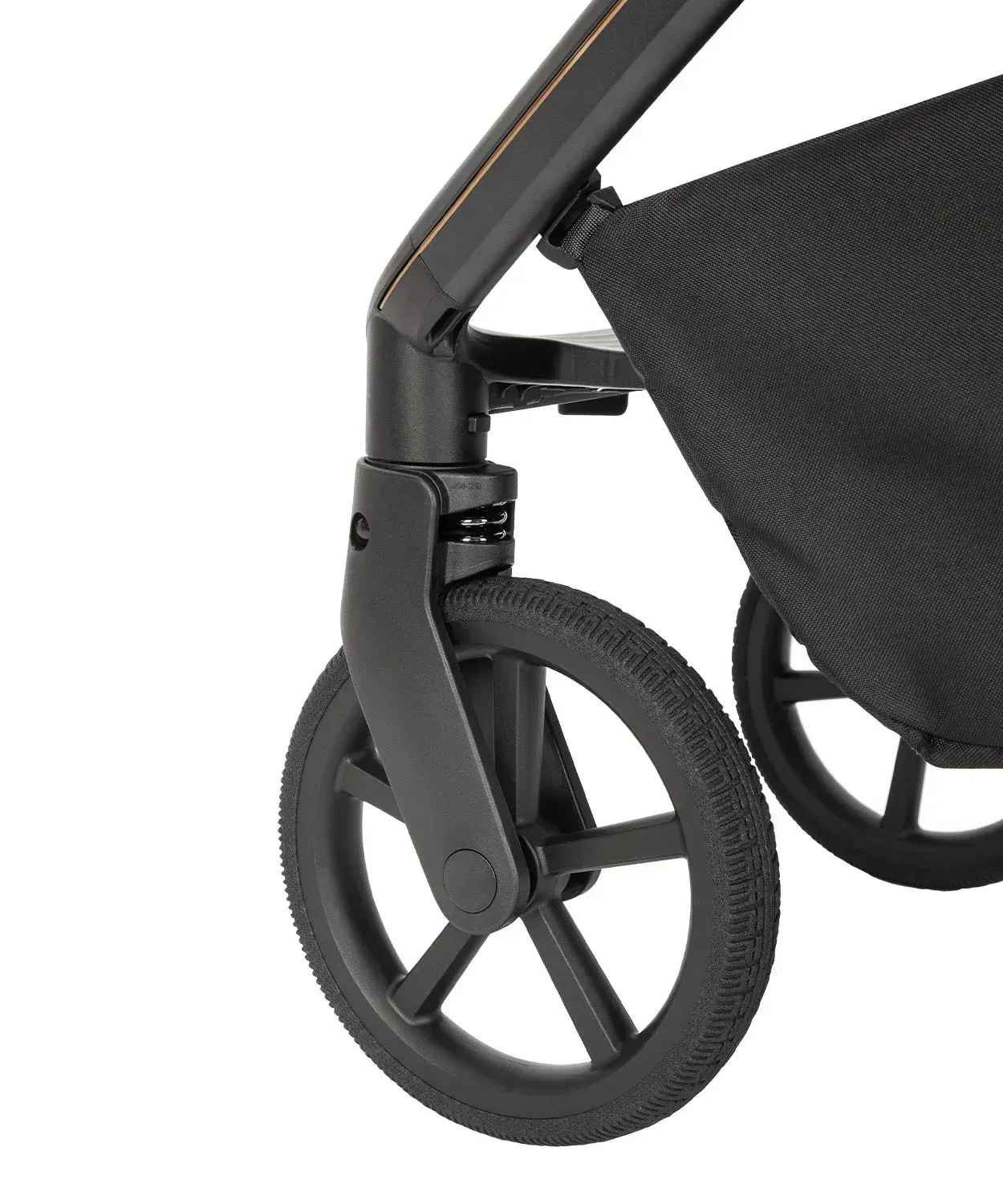 Передние колёса с автоматической стабилизацией, поворотные на 360°, фиксируются в положении «прямо» при помощи удобного переключателя под подножкой.