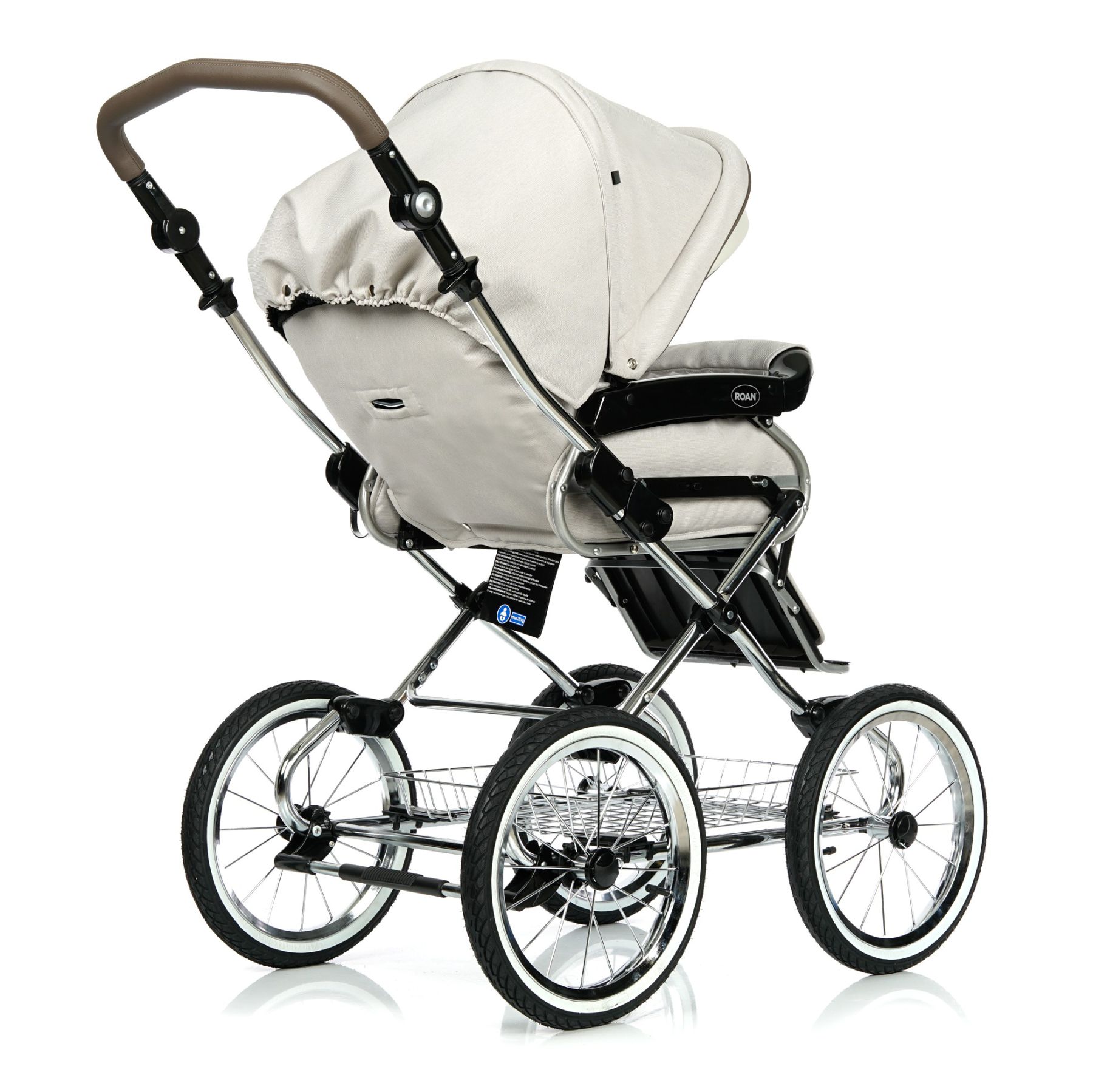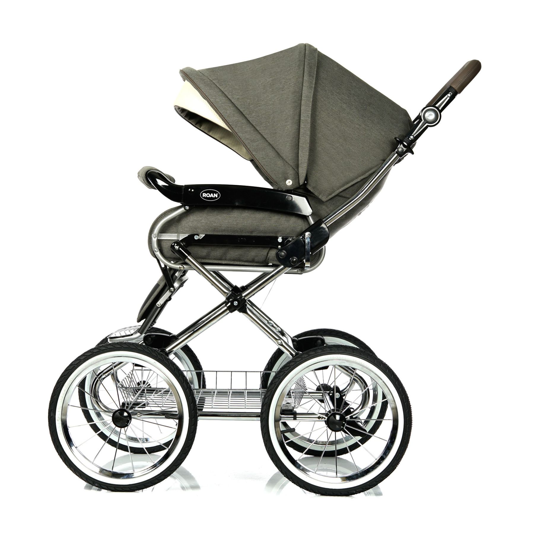 Roan Emma (Роан Эмма) сохранила в своей конструкции чисто классические элементы, например, хромированную раму с металлической корзиной. Надежная рама этой коляски позволяет без труда укачивать малыша благодаря шарнирным соединениям, при этом качать ее можно как в поперечной, так и в продольной плоскости.