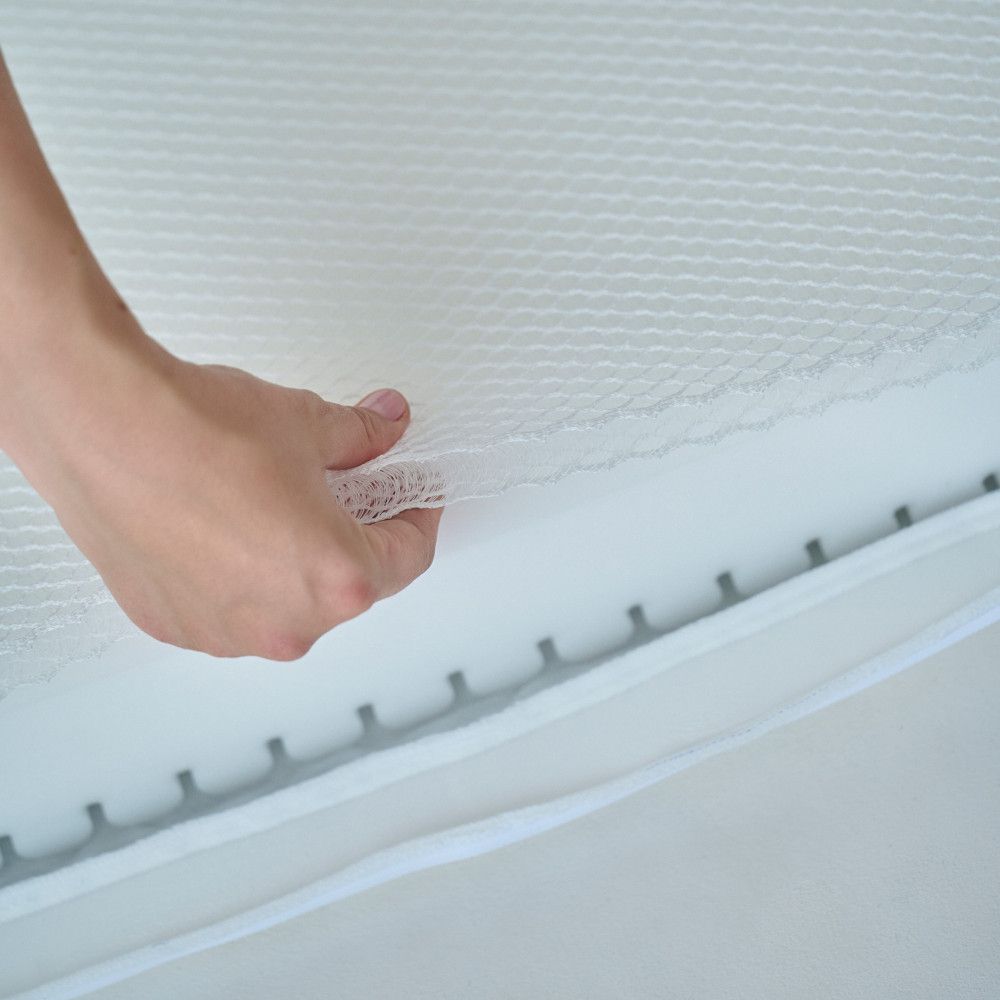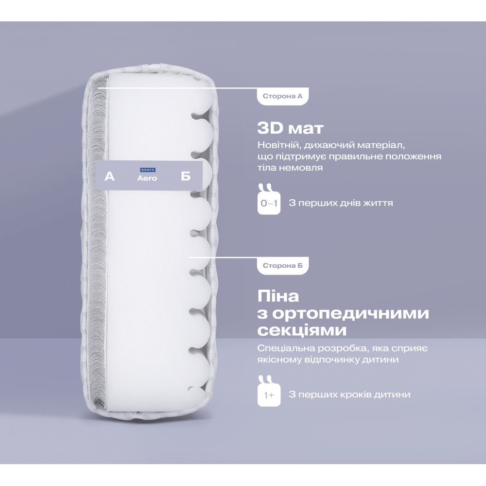 3D мат – это новый дышащий материал, который идеально подходит для сна младенцев с первых дней жизни. Компания Sonto впервые заменила традиционную кокосовую койру на 3D мат, и это не повлияло на жесткость матраса. 3D мат обеспечивает идеальный поток воздуха со всех сторон, не крошится, не деформируется и предотвращает перегрев ребенка. Сторона А из 3D мат в матрасе Sonto Aero предназначена для детей с рождения и до 12 месяцев.