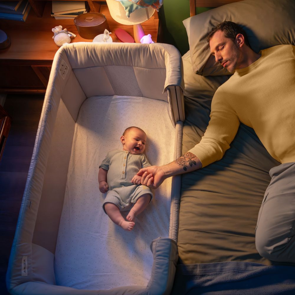 Приставная кроватка. Большой размер спального места и опускающаяся боковина, которую легко открывать и закрывать одной рукой, удобное решение для совместного сна с ребенком от рождения до 4 лет.