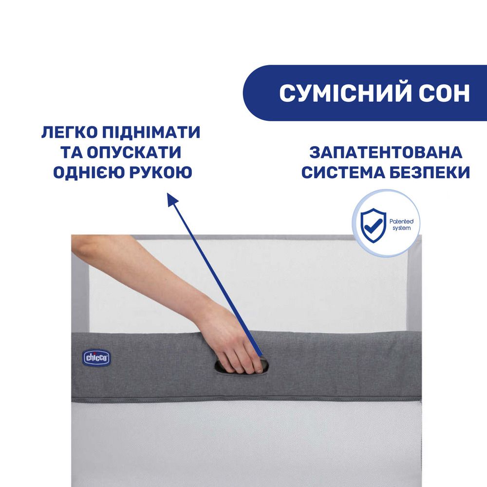 Безопасность. Next2Me Forever оснащена боковым ограждением с запатентованной системой безопасности, которая предотвращает ее опускание, когда кроватка не полностью прикреплена к кровати родителей.