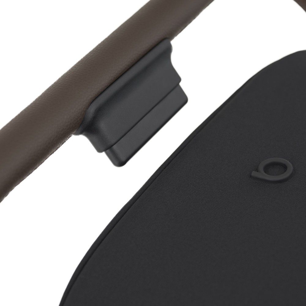 - Кожаный бампер коляски можно полностью снять одной рукой, поочередно отсоединив его с каждой стороны.