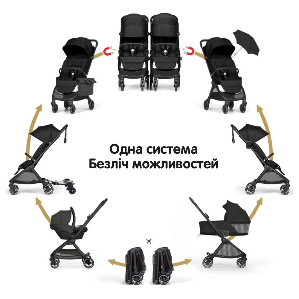 - Инновационная магнитная система: первая в своем роде функция, позволяющая без труда прикреплять аксессуары - или даже две коляски - всего за одну секунду.