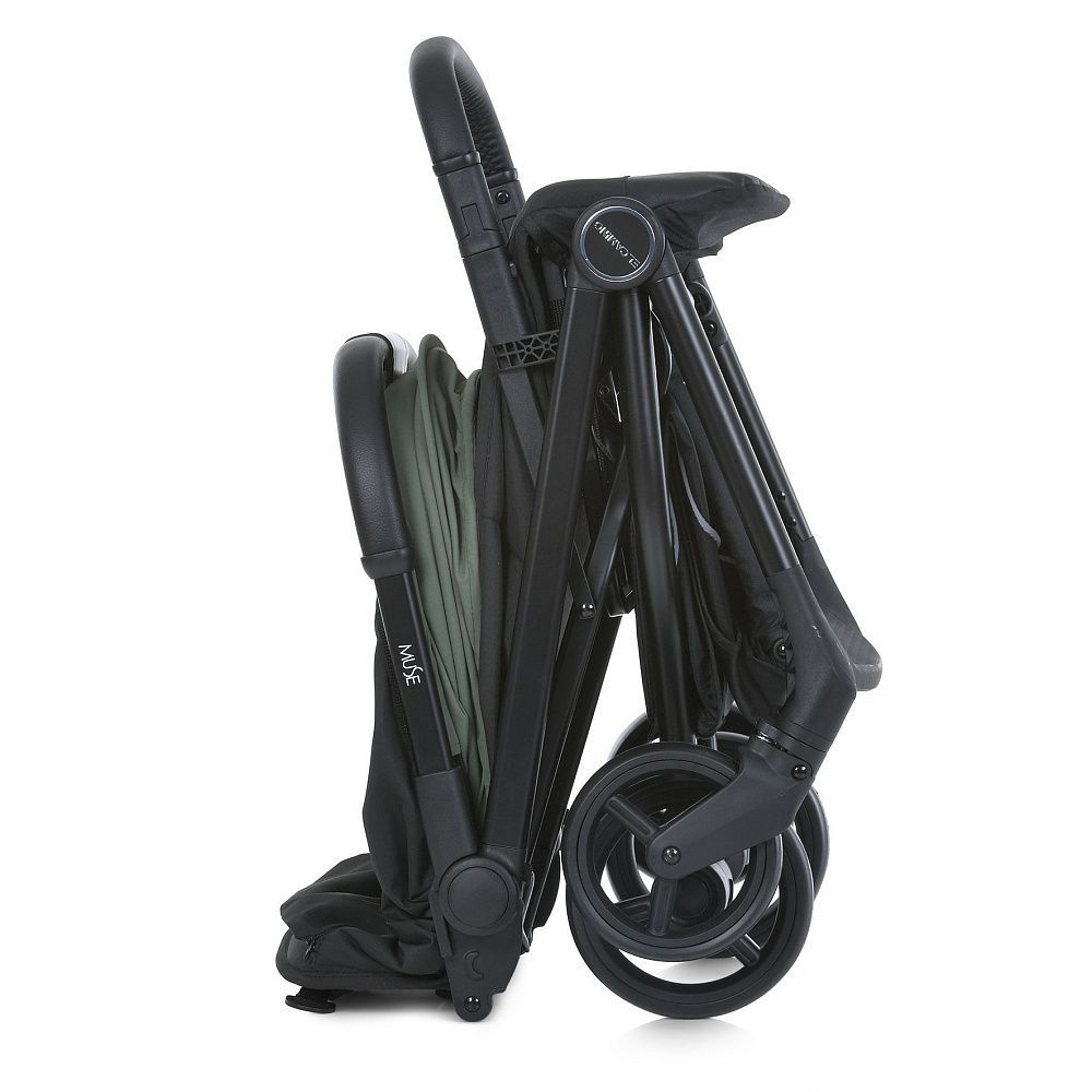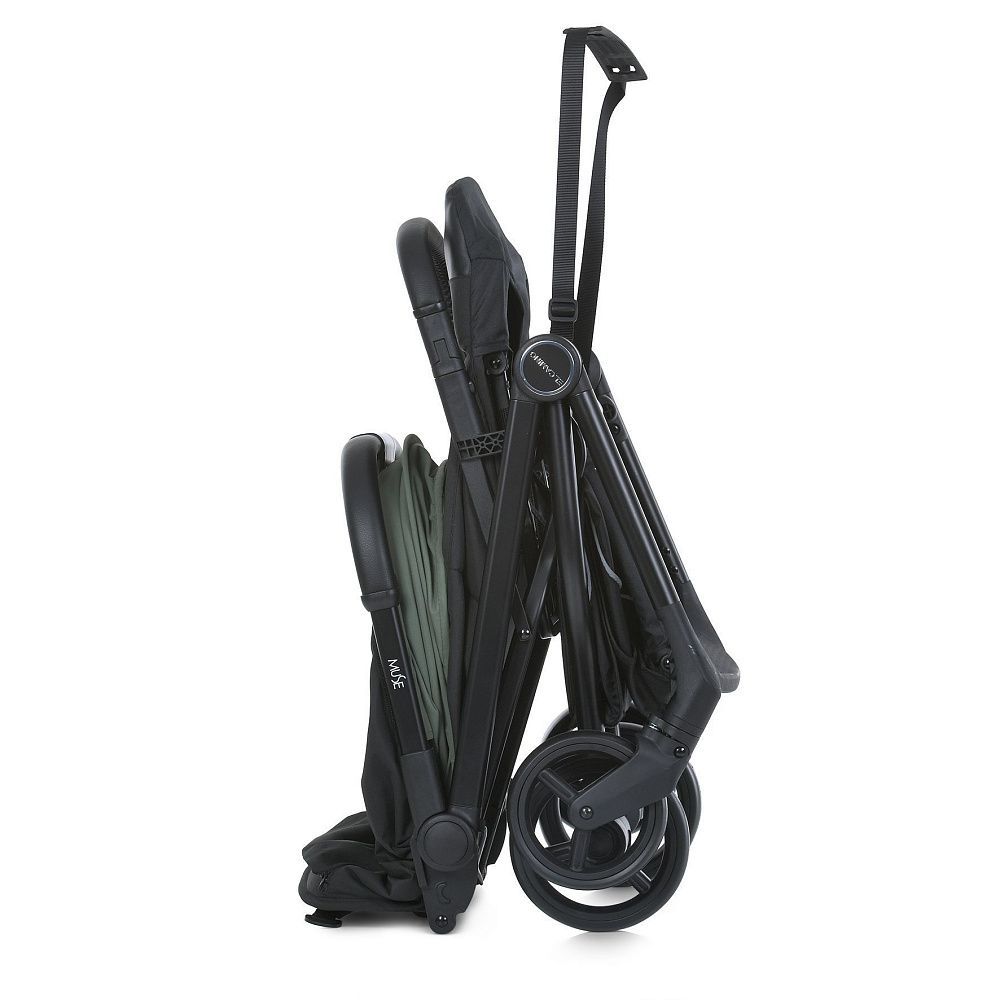 Автоматическая сборка является особенностью коляски , ведь нажимая на две кнопки - предохранитель и основную, вы в одно мгновение превращаете полноценную коляску в компактно сложенную и удобную для переноски. В сложенном виде Muse стоит самостоятельно, присутствует удобный ремешок для переноски.