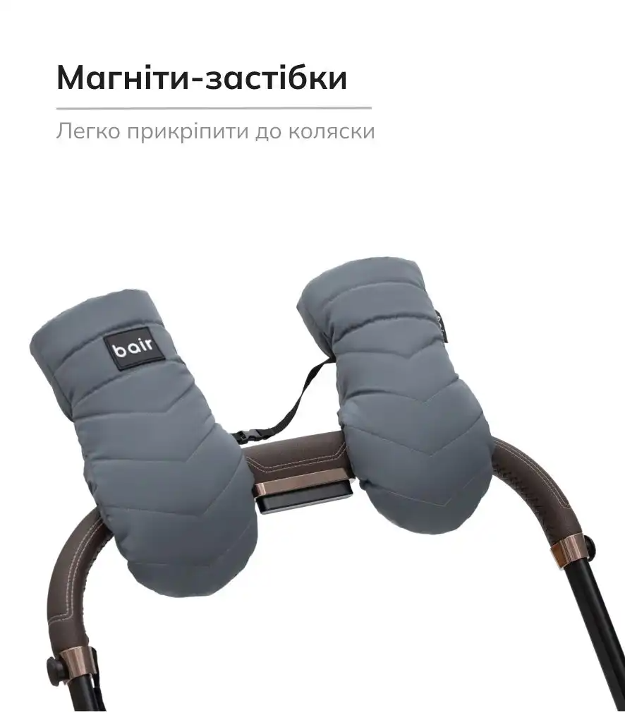 Зимние перчатки Bair Cozy Mitts – это новые перчатки, которые пришли на замену Thermo Mittens. Они оснащены простой и надежной системой фиксации, которая позволяет использовать их не только с разными типами колясок, но и с санками. Фиксируются на коляске с помощью магнитных вставок. Перчатки выполнены из прочного материала, защищающего от ветра и отталкивающего воду. Внутренний материал – мягкий плюш, который надежно сохраняет тепло.