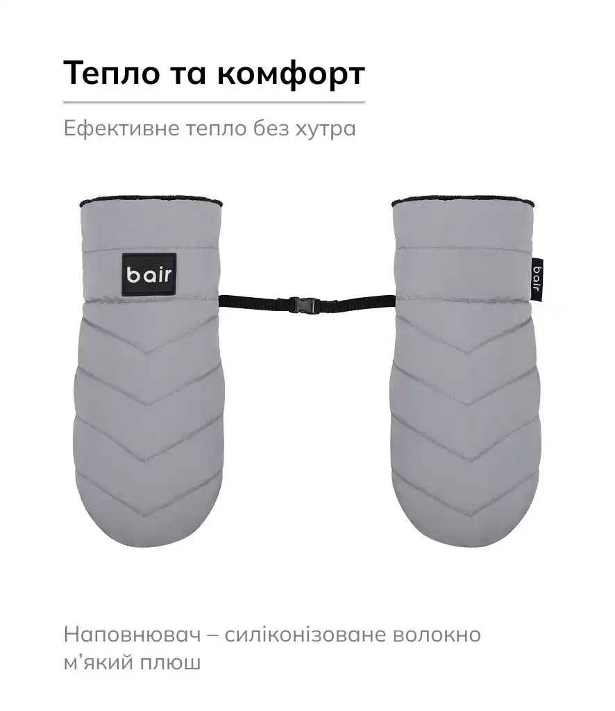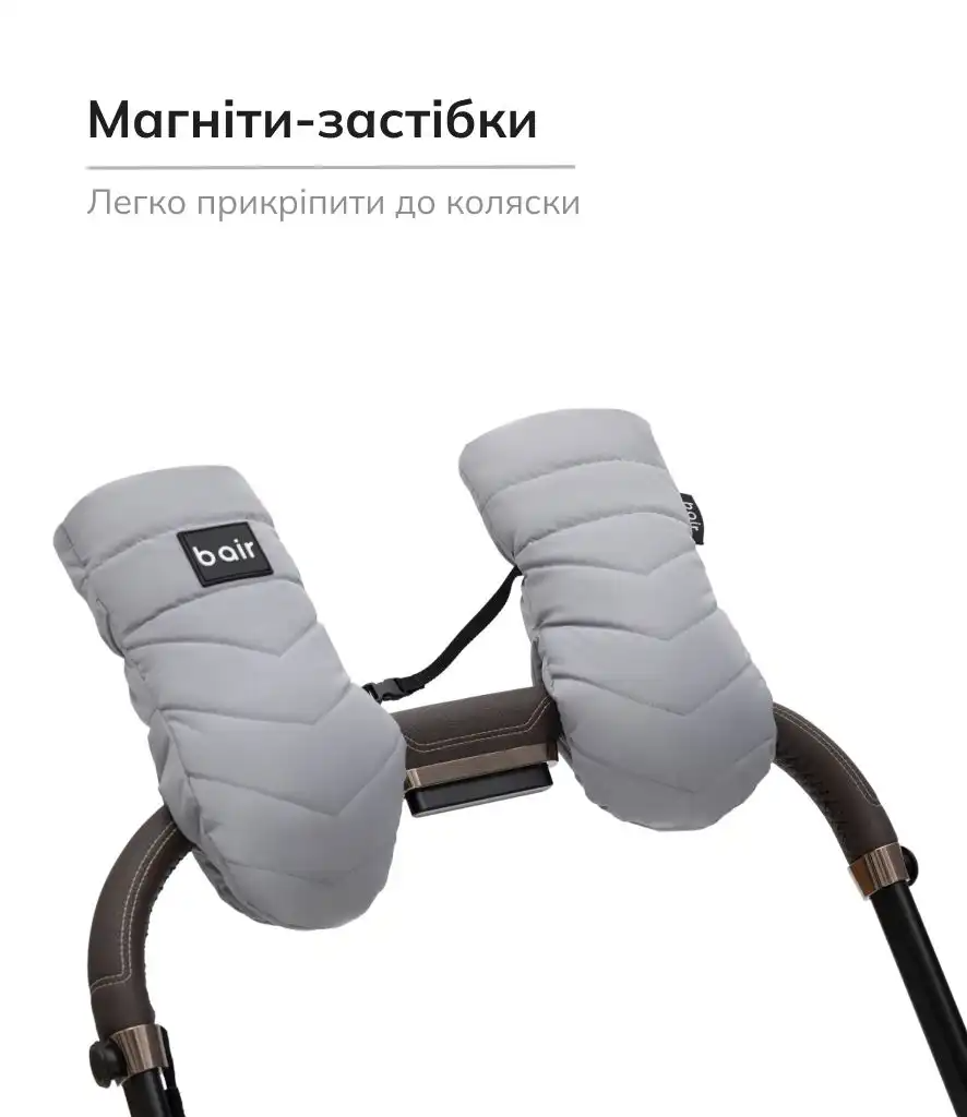 Зимние перчатки Bair Cozy Mitts – это новые перчатки, которые пришли на замену Thermo Mittens. Они оснащены простой и надежной системой фиксации, которая позволяет использовать их не только с разными типами колясок, но и с санками. Фиксируются на коляске с помощью магнитных вставок. Перчатки выполнены из прочного материала, защищающего от ветра и отталкивающего воду. Внутренний материал – мягкий плюш, который надежно сохраняет тепло.