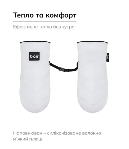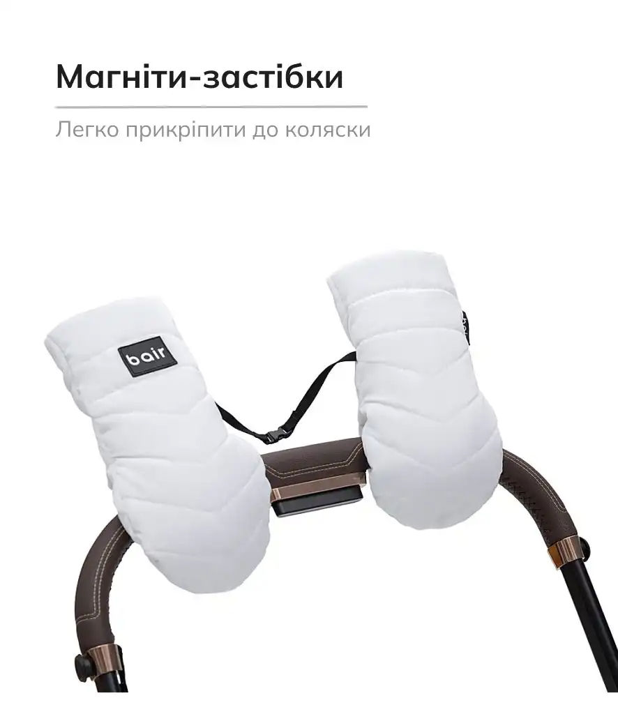 Зимние перчатки Bair Cozy Mitts – это новые перчатки, которые пришли на замену Thermo Mittens. Они оснащены простой и надежной системой фиксации, которая позволяет использовать их не только с разными типами колясок, но и с санками. Фиксируются на коляске с помощью магнитных вставок. Перчатки выполнены из прочного материала, защищающего от ветра и отталкивающего воду. Внутренний материал – мягкий плюш, который надежно сохраняет тепло.