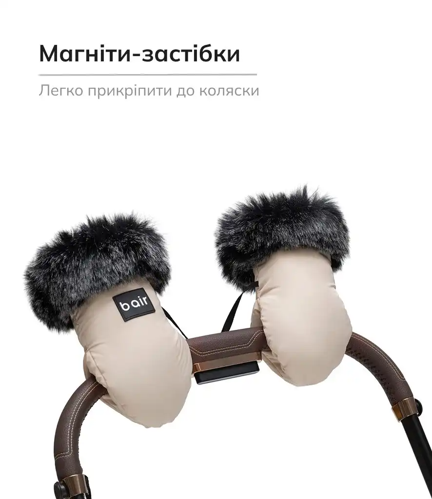 Рукавицы Bair Northmuff - удобные, приятные на ощупь перчатки для коляски. Непромокаемый, грязеотталкивающий наружный материал, сохранит надолго внешний вид изделия. Благодаря своему размеру рукавицы надежно защитят руки не только мамам, но и папам. Они подходят к любой детской коляске или санкам. Прикрепить их просто - при помощи надежных магнитов.