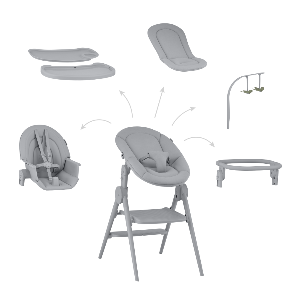 - Сиденье стульчика для кормления имеет 2 угла наклона и 2 уровня высоты, а также подножку для старших детей.