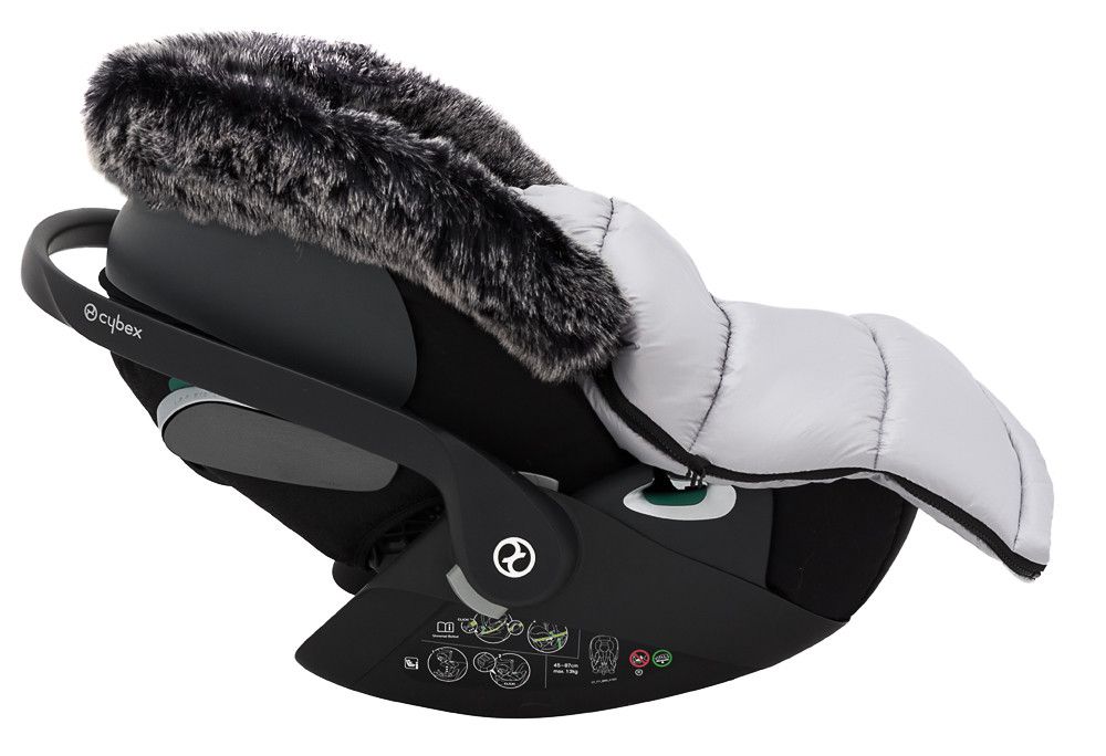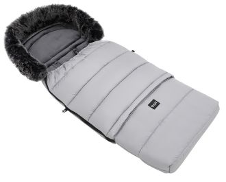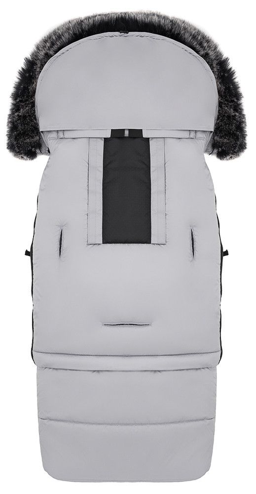 Капюшон конверта плотно стягивается для сохранения тепла внутри, и отделан съемным мехом.