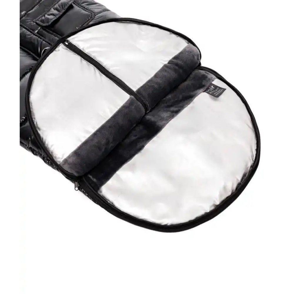 Также конверт оснащен передней планкой на магнитах, которая легко отворачивается для удобства ребенка. Двухсторонние боковые молнии позволяют быстро и удобно разместить ребенка внутри конверта, а в теплые дни верхнюю часть можно открыть и зафиксировать по бокам. Благодаря кулиске с фиксатором в области шеи, конверт можно равномерно затянуть, что позволит надежно обернуть все тело ребенка.