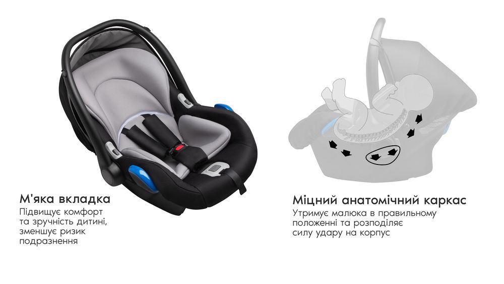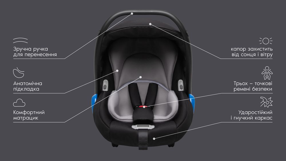 - Малюк утримується в кріслі вбудованими 3-точковими ременями безпеки з м'якими накладками.