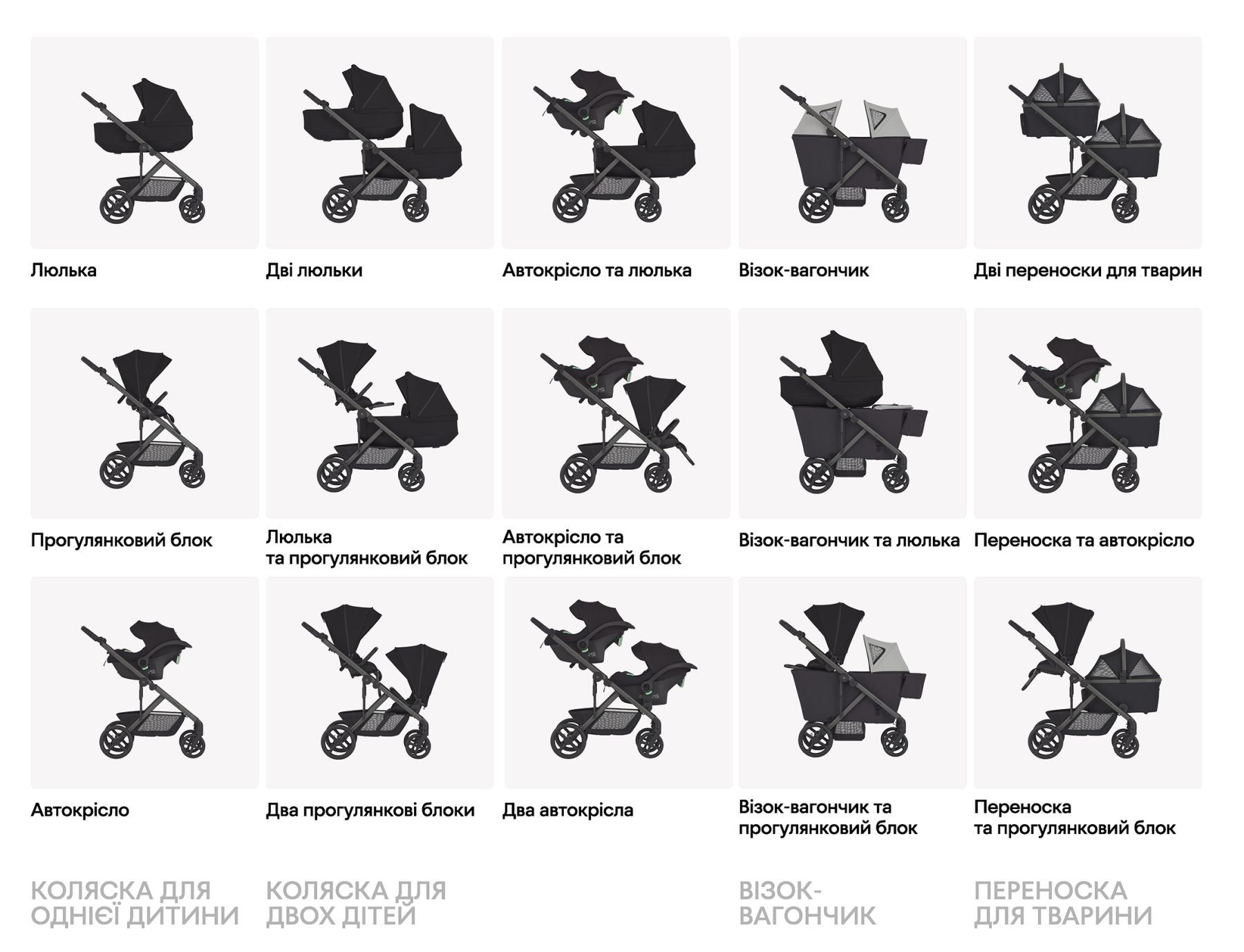 - Завдяки унікальній трансформації коляски вона ідеально підходить для близнюків чи погодок.